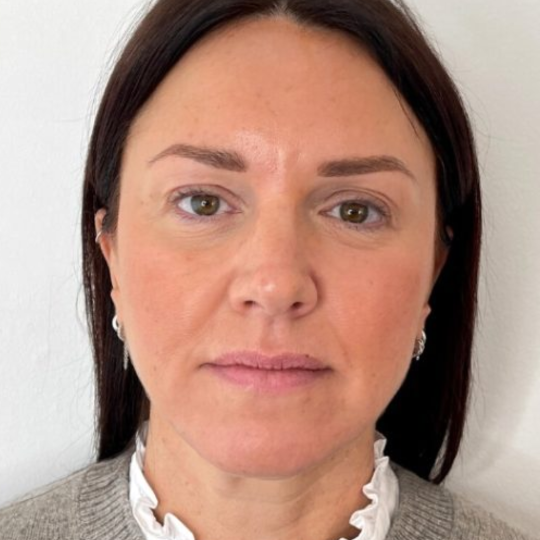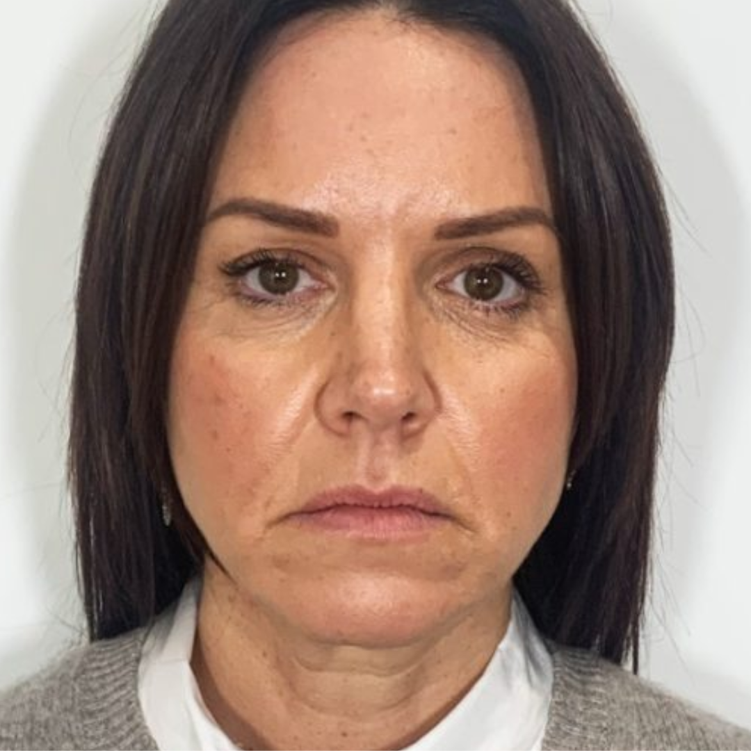 Carmen, de 54 años, participó en un programa de seguimiento clínico orientado a evaluar la eficacia del tratamiento con radiofrecuencia térmica, EMS de liberación lenta, luz roja terapéutica y vibración de baja frecuencia sobre la flacidez cutánea del cuello y la pérdida de definición mandibular.